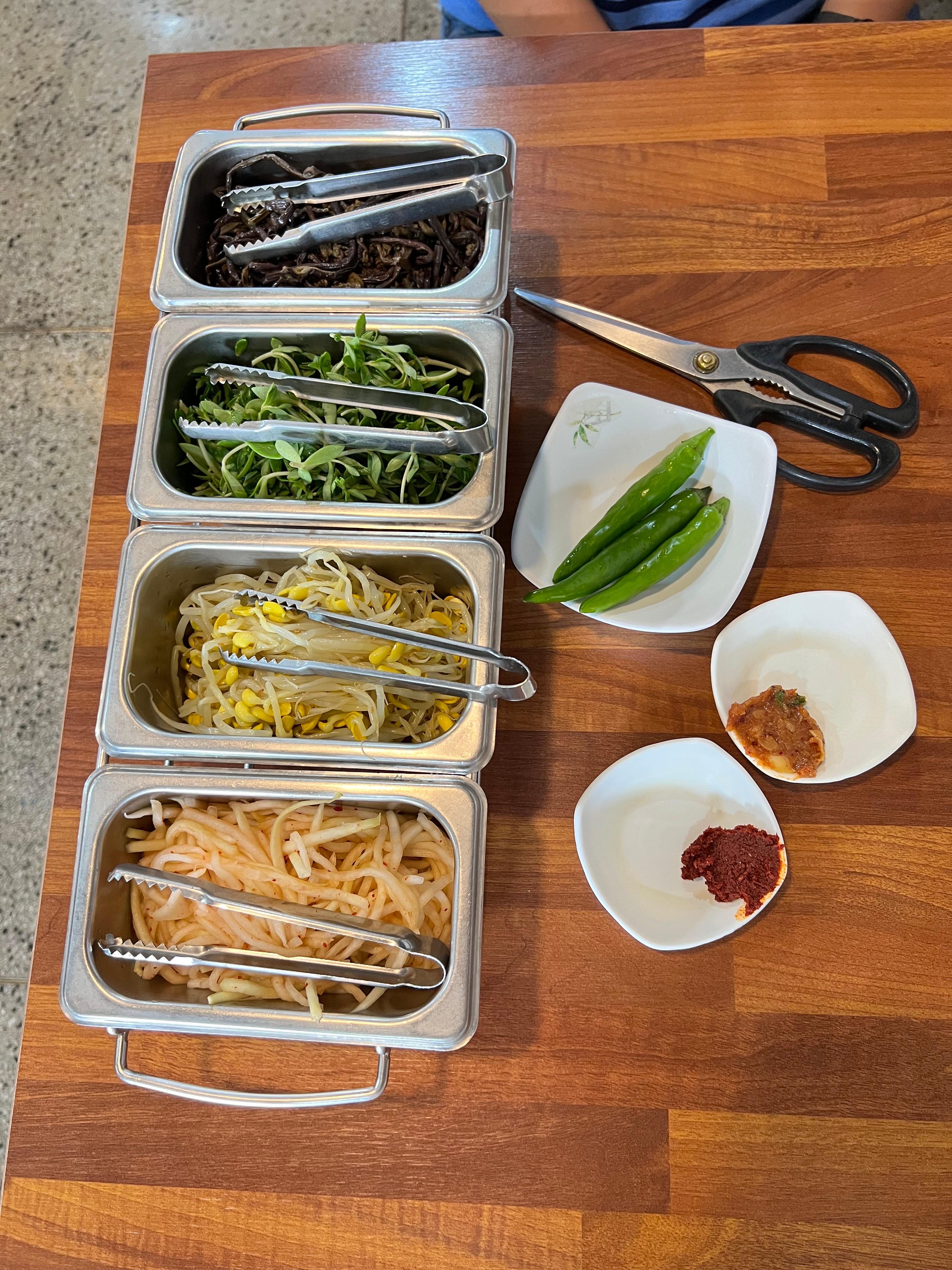 테이블마다 위생적으로 비빔밥용 나물을 덜어먹을 수 있게 아주 웅장한 모습으로 나물 4종이 제공되며, 심지어 나물은 길어서 많이 씹히니깐 먹기 편하게 자르라고 가위도 함께 제공해 주신다!